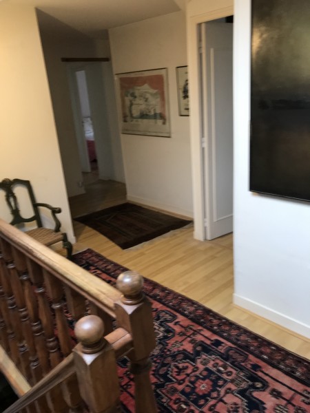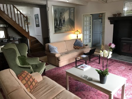 A large hall (which could be extended to make a separate dining room) leads to a spacious living area and on to a well-fitted kitchen. All three rooms have double French windows to the garden providing wonderful natural light. There is a beautiful just-fitted shower room downstairs and a separate shower-room upstairs, where, around a spacious landing you will find two elegant bed-sitting rooms, a further double bedroom and a fourth bedroom currently used as a brightly-lit study. Heating (together with cooling) comes from air-pump fans and a 15 kilowatt log burner.
