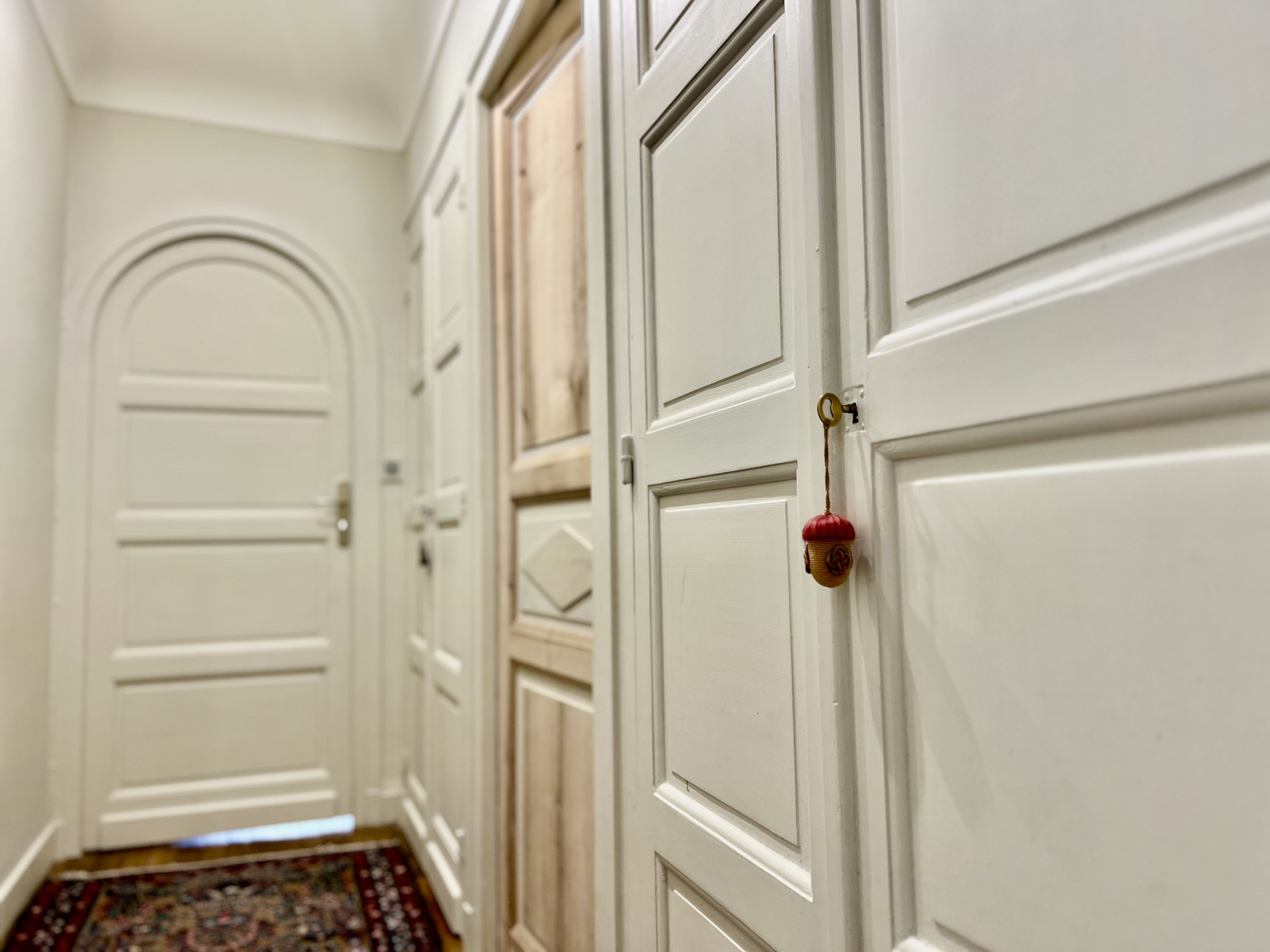 Access from the first floor via armoured door with intercom (integrated camera), beautiful wooden staircase leads to landing with living room, kitchen with balcony and WC.