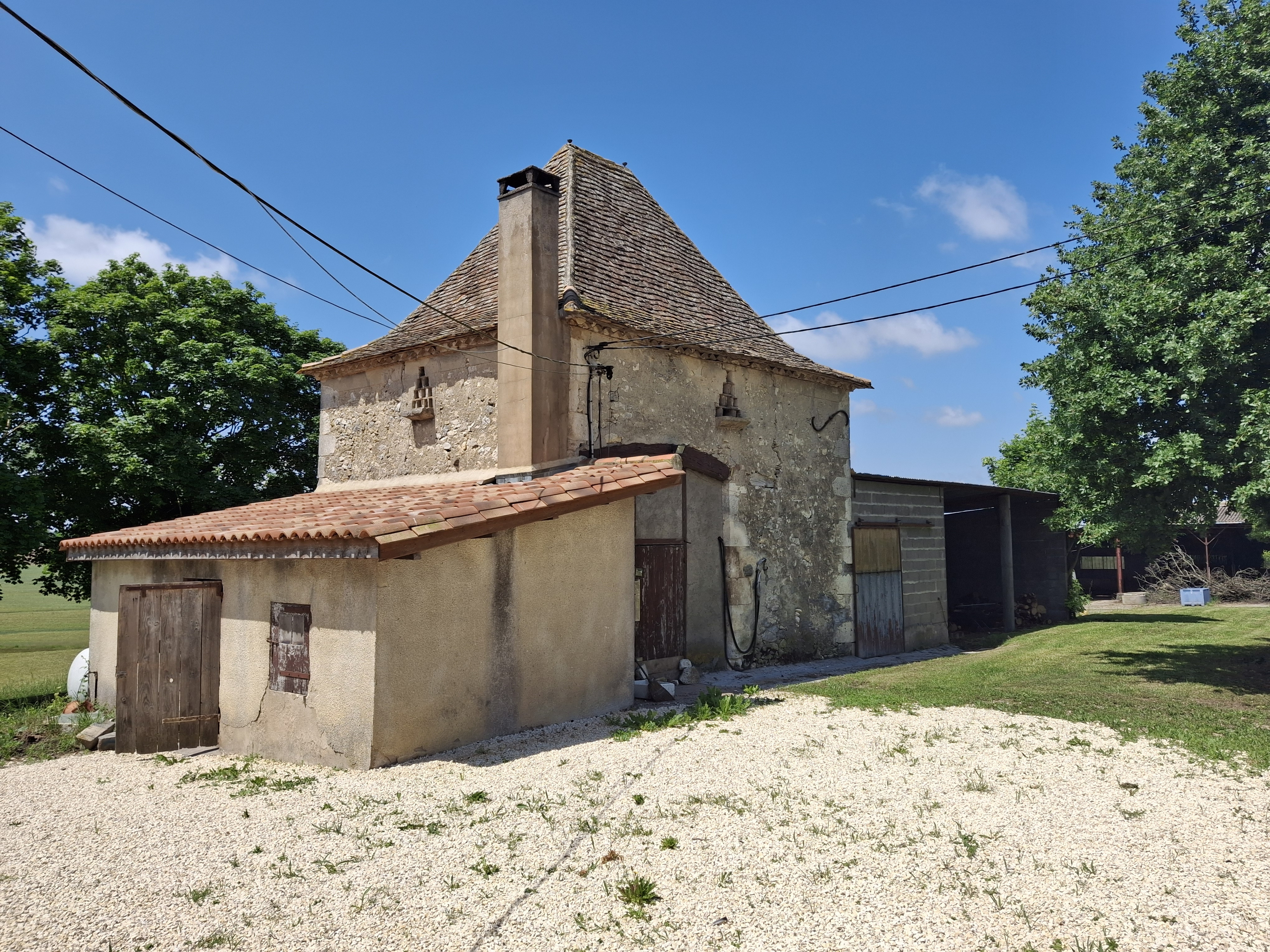 Located in a beautiful and peaceful setting, at the end of a path, this former farm offers a 110m2 house with 2 bedrooms and an office that can be converted into 2 dwellings, an old tobacco barn, an old 'pigeonnier', lean-to and the ruins of an old barn on approximately 5500m2 of land (possibility of more) with a well and a dominant view over the rolling countryside.