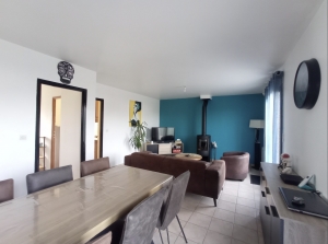 - Ground floor: Life is possible on one level because we have a bright entrance with a recent aluminum front door, a kitchen-diner with a recent aluminum window also, a pleasant living room with a wood stove like new and the 2 French windows give direct access to the sunny and quiet terrace with an electric awning.
