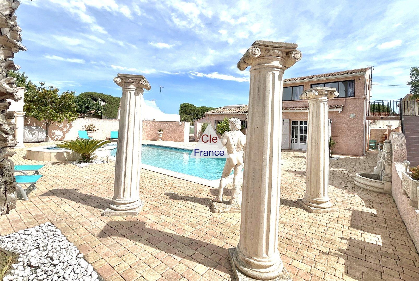 REDUCED in price - Villa of approximately 144m² with SWIMMING POOL on enclosed land of 800m2 This property is located in a privileged and quiet location 300m from the beaches, restaurants and shops. By crossing the electric gate, via a paved driveway you access the villa (possibility of parking several vehicles and two Garages). It is composed:
