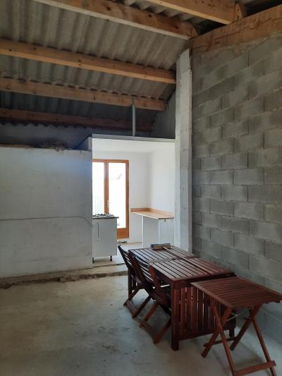 - Ground floor: Living room/kitchen of 16 m2 (cupboards, sink, electrical oven, gas hob, fridge), hall of 5.2 m2, lounge of 17 m2 with fireplace, bathroom of 4 m2 (washbasin, bath and WC).