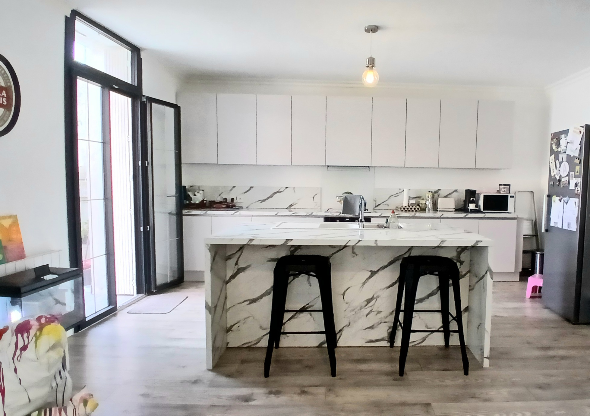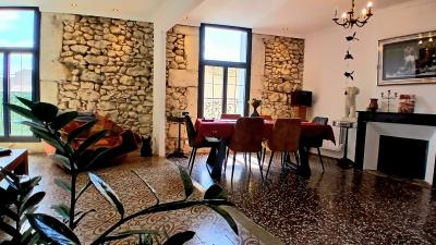 - 1st floor: Hallway of 5 m2, bright living room of 45 m2 with exposed stone walls, 2 balconies and a marble fireplace, storage cupboard of 2.42 m2, shower room/laundry room of 4.78 m2 (WC, hand basin unit, shower, laundry area), spacious, contemporary kitchen of 36 m2 (large central island, induction hob, extractor hood, double sink, storage units:) with a decorative fireplace and access to the terrace, pleasant 65 m2 terrace.