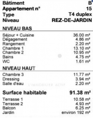 Grand Selve sector in Toulouse, you will be the first privileged occupant of this spacious 91.38 sq m (980 sq ft) 3-bedroom duplex apartment on the ground floor with a 192 sq m (2,058 sq ft) outdoor space. Large living room with open-plan fitted kitchen facing south. Two bedrooms opening onto a terrace and a master suite with its own shower room and rooftop terrace. Bathroom, WC.