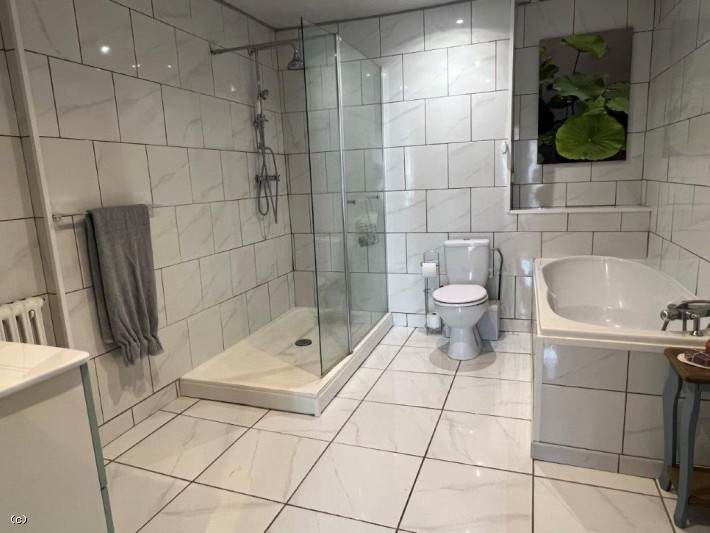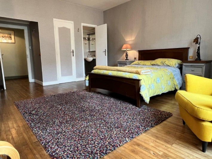 Bedroom 1 (20m2) with direct access to the bathroom (9.50m2): parquet flooring, tiled floor, bath, shower, basin, WC