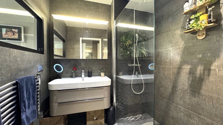 The apartment has been completely renovated and offers high-end amenities. It comprises a double living room with an open-plan kitchen opening onto a lovely furnished terrace, three bedrooms, a master bedroom with an en-suite shower room, a bathroom, two large dressing rooms, and three additional bedrooms opening onto a fully equipped 30 sq m (323 sq ft) terrace.