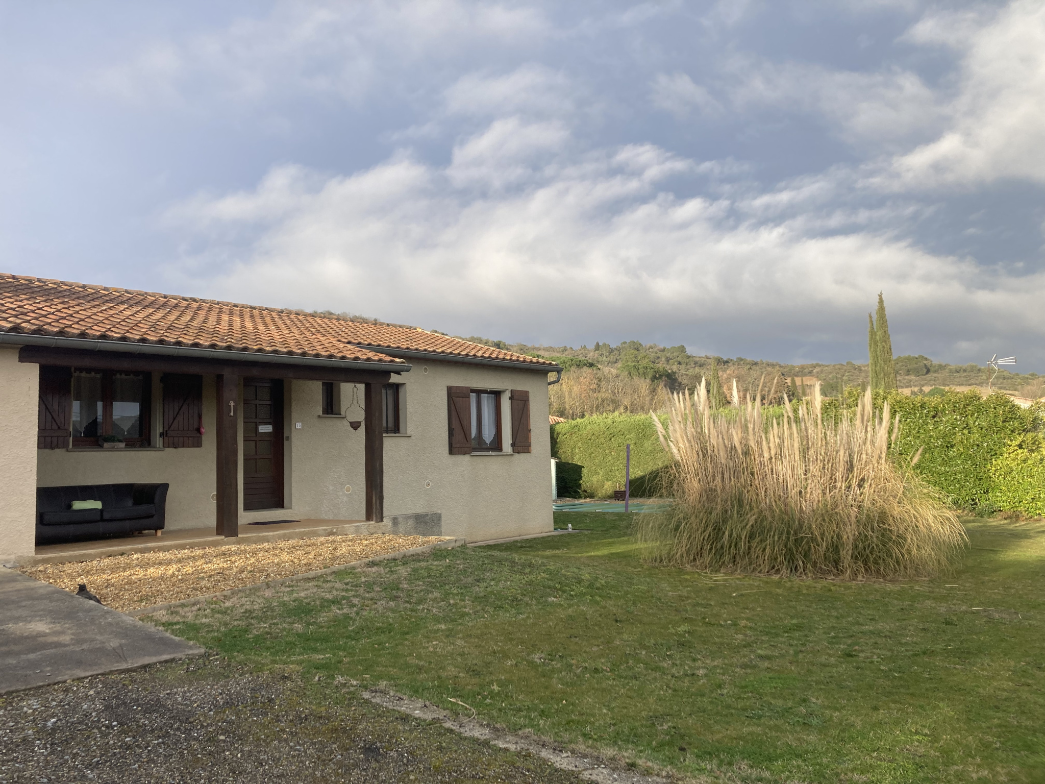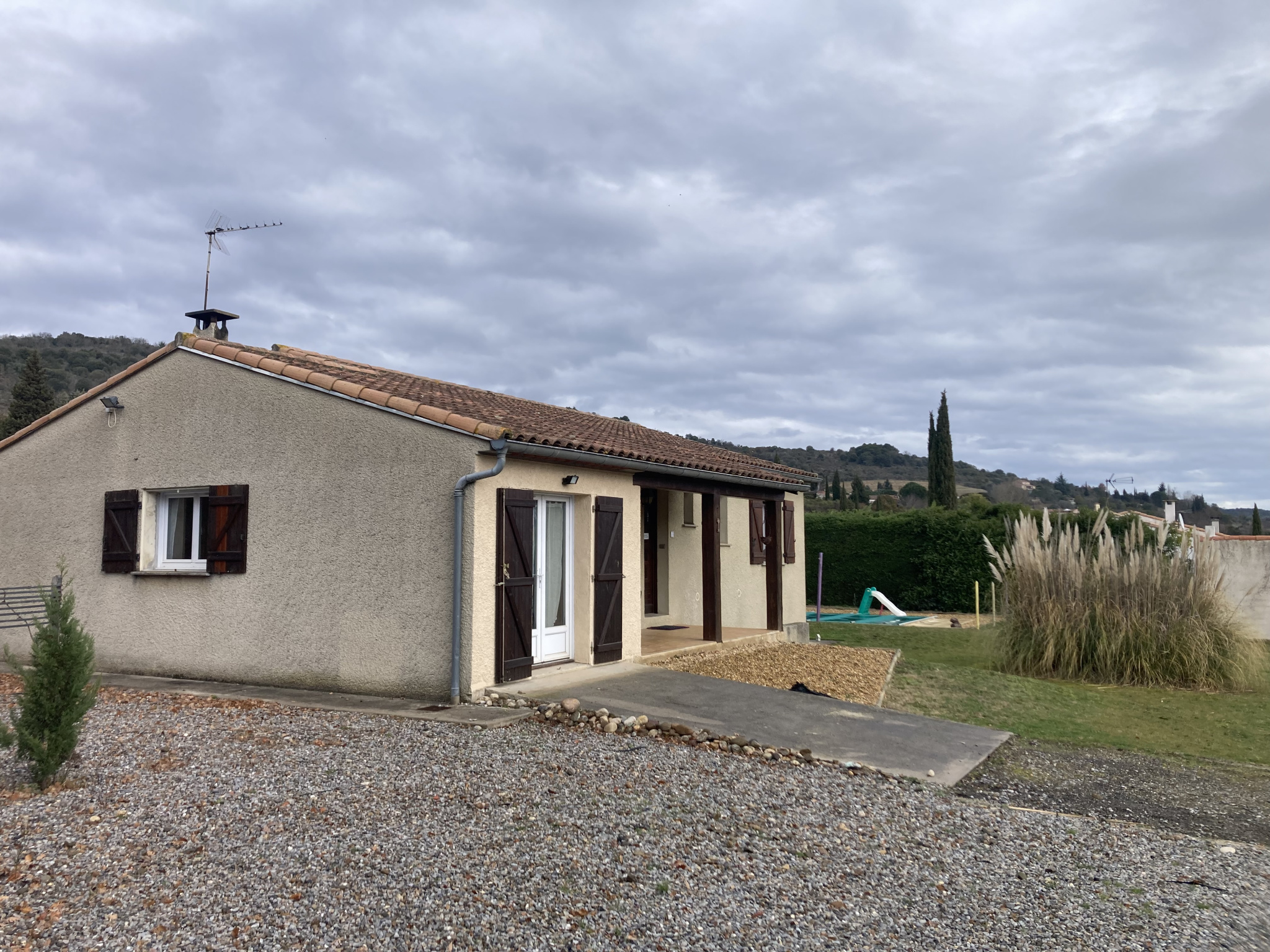 In a village with all amenities near Limoux, a detached villa on a beautiful plot with a swimming pool, 3 bedrooms, a living room with an insert fireplace, a conservatory, and terraces. In good condition and well-maintained, however, the single-glazed windows would benefit from replacement, and the property could be updated to modern standards.