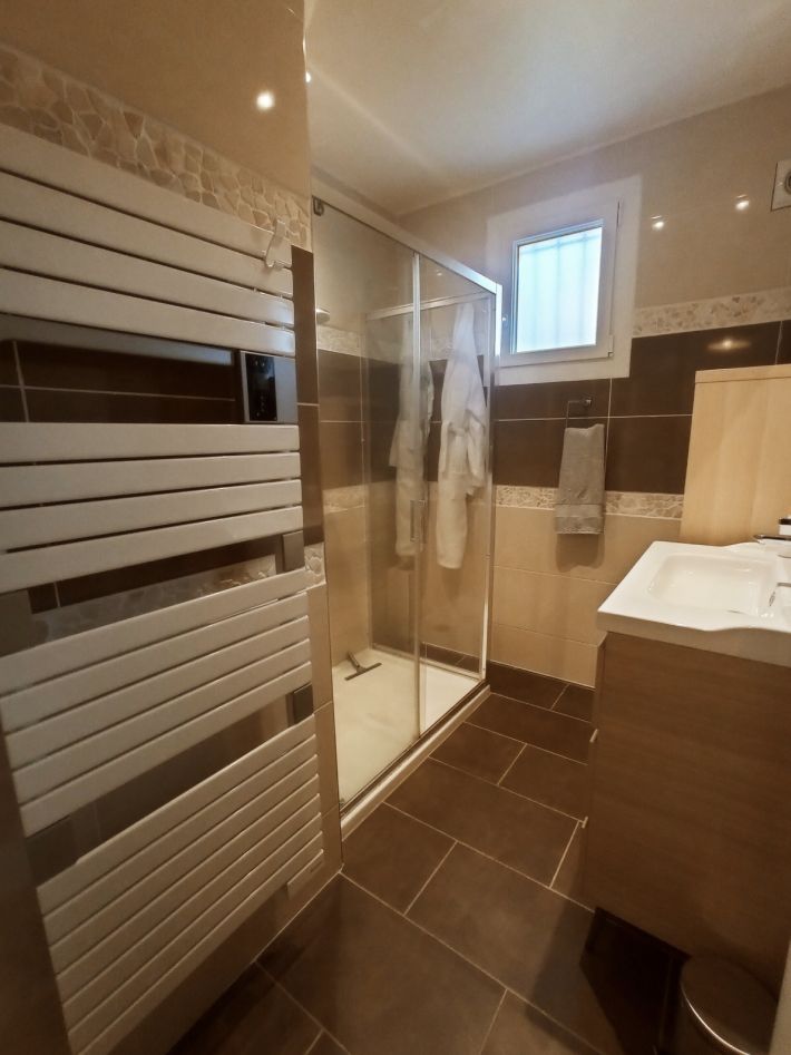 It is organised as follows: a very bright entrance, a warm living room with a wood stove, three bedrooms including a bedroom on the ground floor, a new independent kitchen, fitted and equipped, a modern shower room and separate toilets.