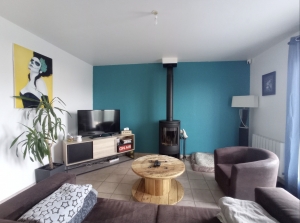 - Ground floor: Life is possible on one level because we have a bright entrance with a recent aluminum front door, a kitchen-diner with a recent aluminum window also, a pleasant living room with a wood stove like new and the 2 French windows give direct access to the sunny and quiet terrace with an electric awning.