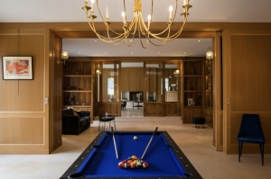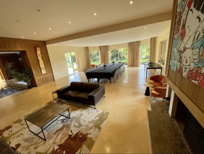 - Ground floor: A large, welcoming and functional entrance hall with a cloakroom and toilet, followed by a dining/billiard room, a home cinema lounge opening onto a spacious reception room overlooking the lush park with a bar area and fireplace for sharing cozy moments with family or friends. Also on the ground floor, a fully fitted and equipped kitchen will delight every chef in us thanks to its refined atmosphere, followed by a service entrance, a shower room/WC, a laundry room that can be converted into a pleasant bedroom opening onto the terrace, and finally a large pantry and technical room providing ample storage space.