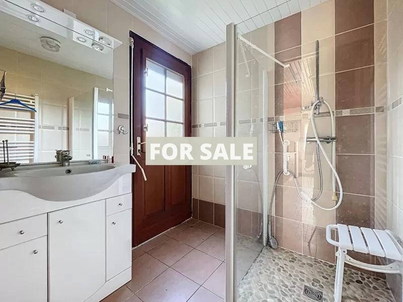 House for sale in Gouville-sur-Mer, with a living surface area of 110 m2 on a plot of 3500 m2. This 5-room house includes 3 bedrooms, a fitted kitchen, a south-west-facing living room, a bathroom, a shower room, and 2 toilets. It has oil-fired heating with radiators, a hot water boiler, and an open fireplace.