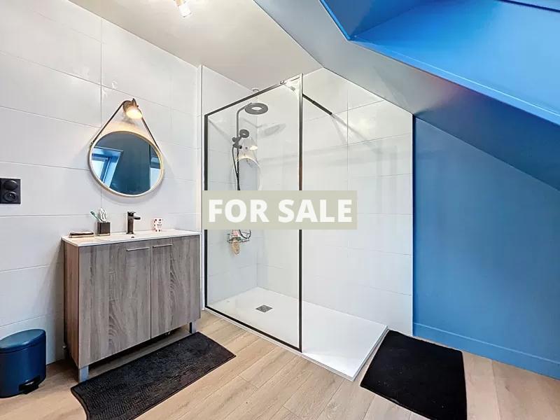 - Ground floor: an entrance hall, a lovely living / dining room with a pellet stove (primary heating), an open-plan fitted and equipped kitchen, a WC, a utility room, and a garage.
