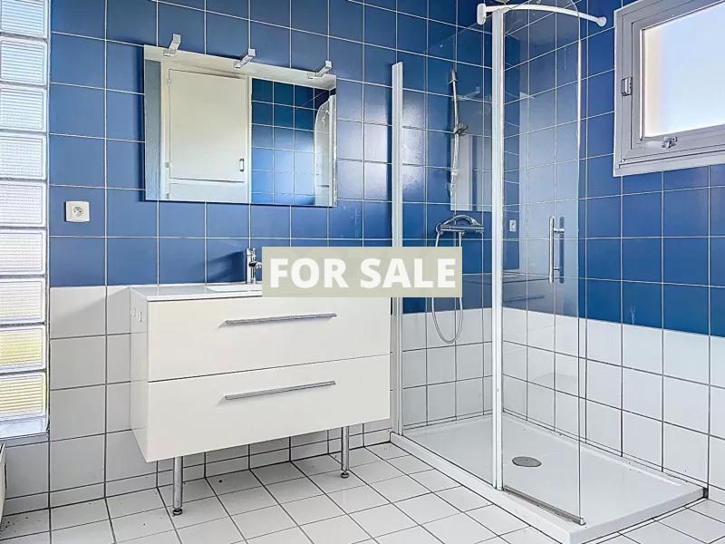 - Ground floor: an entrance hall, a double living room of approximately 38 m², a separate kitchen, a pantry, two bright bedrooms, a large shower room, and a separate toilet.