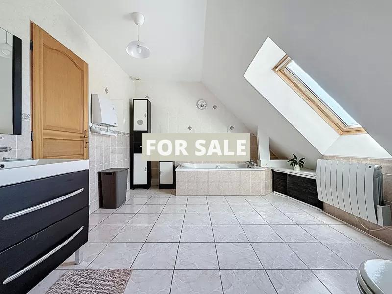 - First floor: a mezzanine landing, three bedrooms, a bathroom with bathtub and shower, a dressing room, and a WC.