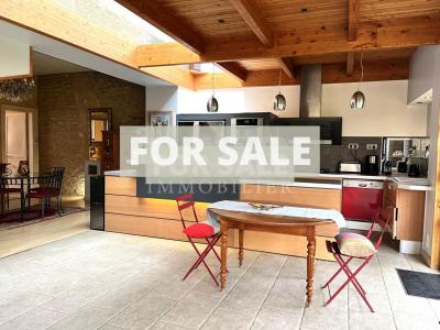 With approximately 170m² of living space, the ground floor comprises an entrance hall leading to a living room with a fireplace, a light-filled open-plan living/dining room with a wood-burning stove, and a beautiful fitted and equipped kitchen.