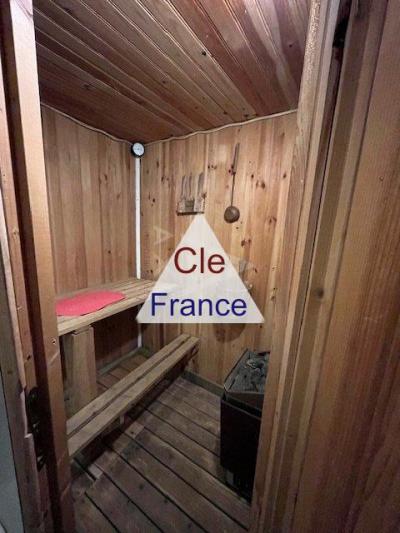 The main house features a large open-plan living area with a lounge, dining room, and kitchen. A hallway leads to a WC and a room with a sauna and shower.