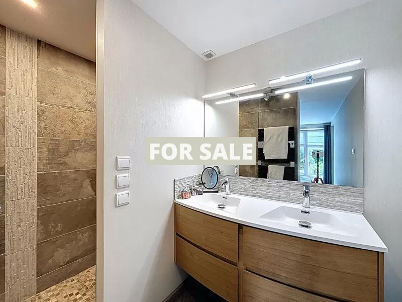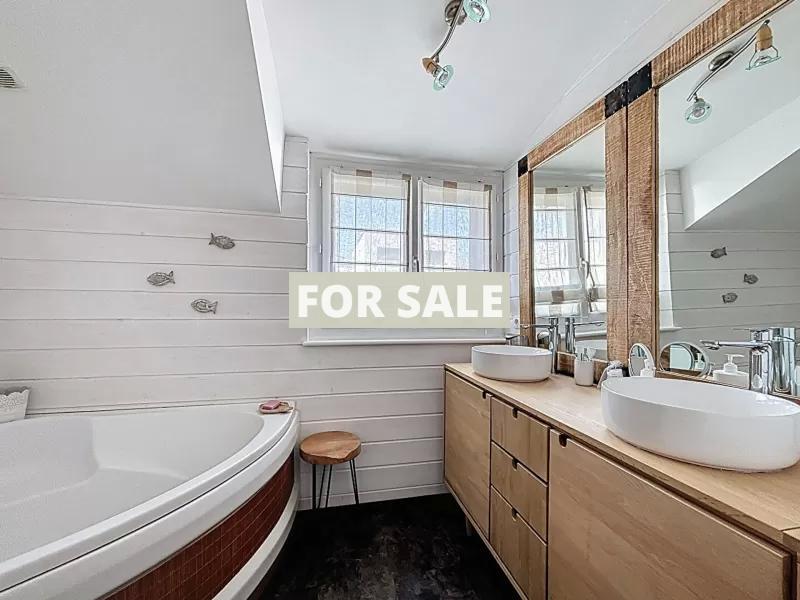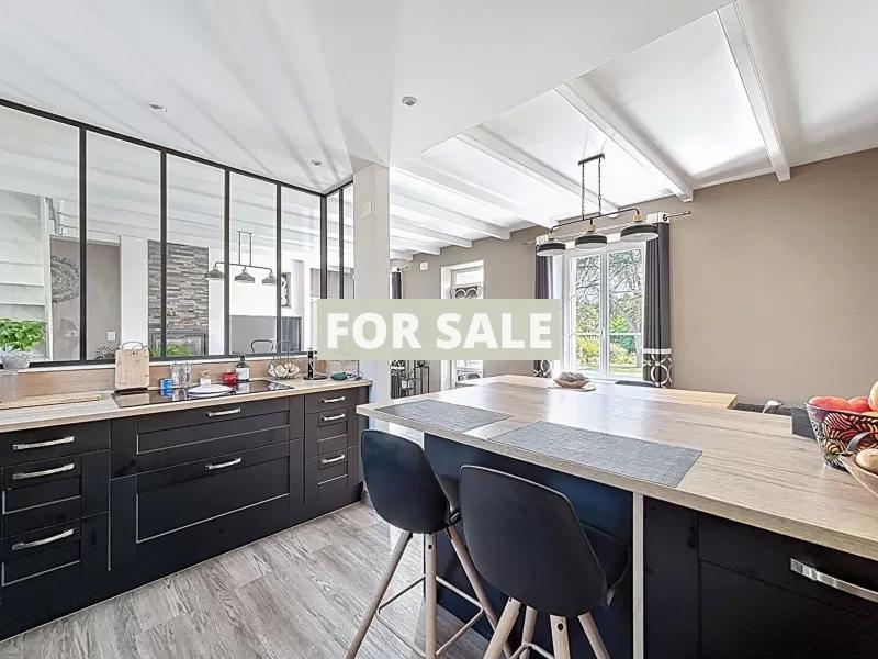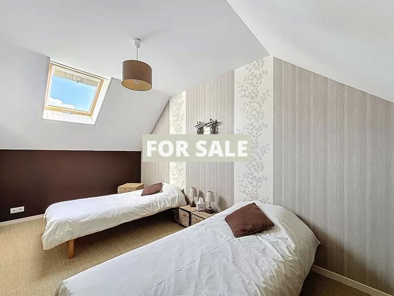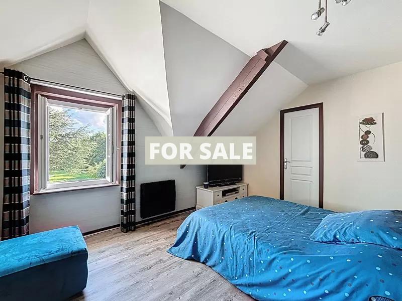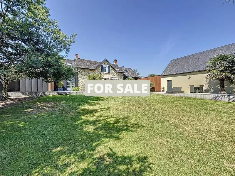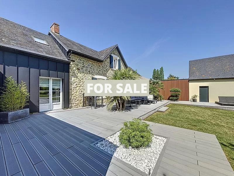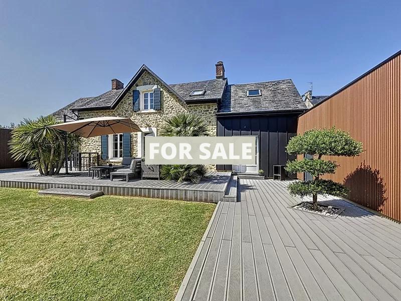 A proximite de Granville, dans un cadre verdoyant et sans vis a vis, cette belle maison en pierre. Elle se compose : - Au rez-de-chaussee : grande entree avec dressing, sejour-salon avec insert, cuisine amenagee et equipee, suite parentale avec dressing et salle d\'eau, wc. - A l\'etage : trois chambres, salle de bains, bureau, wc. Vous disposerez d\'une grande terrasse exposee sud et d\'un jardin arbore d\'environ 1500 m2. Un grand garage de 52 m2 vient completer l\'ensemble. Cette maison en parfait etat se situe a 5 minutes des plages et des commerces.