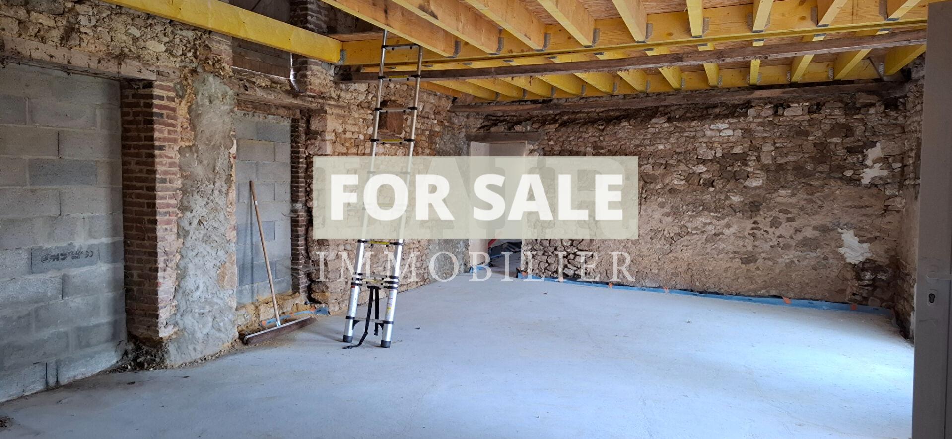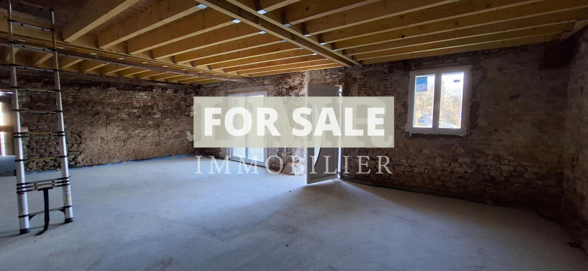 Le gros oeuvre a deja ete realise, avec un travail de maconnerie significatif incluant le retrait d\'un mur porteur a l\'interieur. Des ouvertures ont ete creees, offrant ainsi une grande piece de vie, un espace cuisine, et la possibilite d\'amenager des chambres a l\'etage, ainsi qu\'une salle de bain. Une dalle de beton a ete posee sur l\'ensemble du batiment, avec polyane et isolation, et les evacuations ont ete integrees.