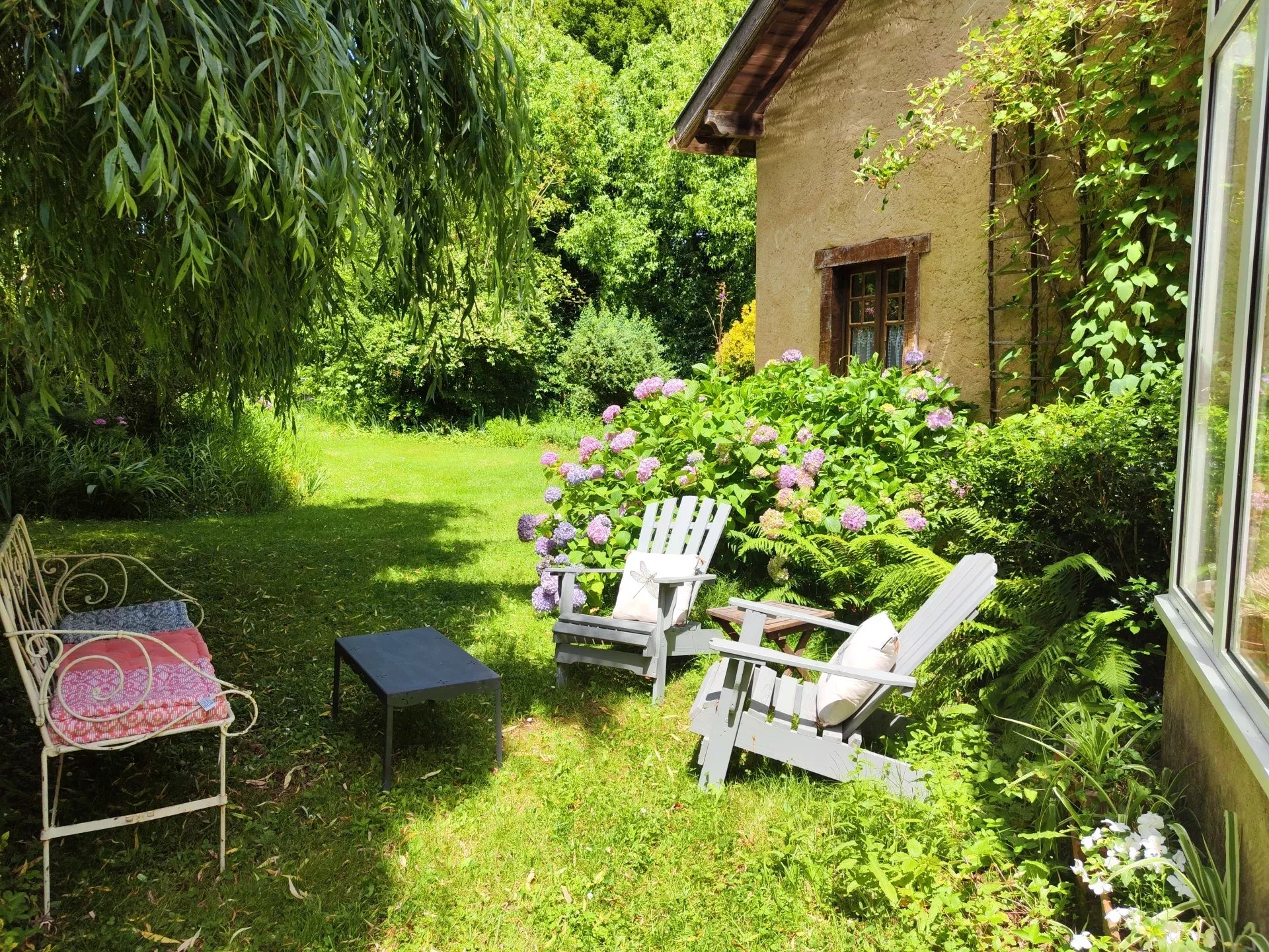 The main house with its 3.30m high ceilings offers a living-kitchen-dining room area with wood-burning stove, three bedrooms, an office, a bathroom and separate WC on the ground floor.