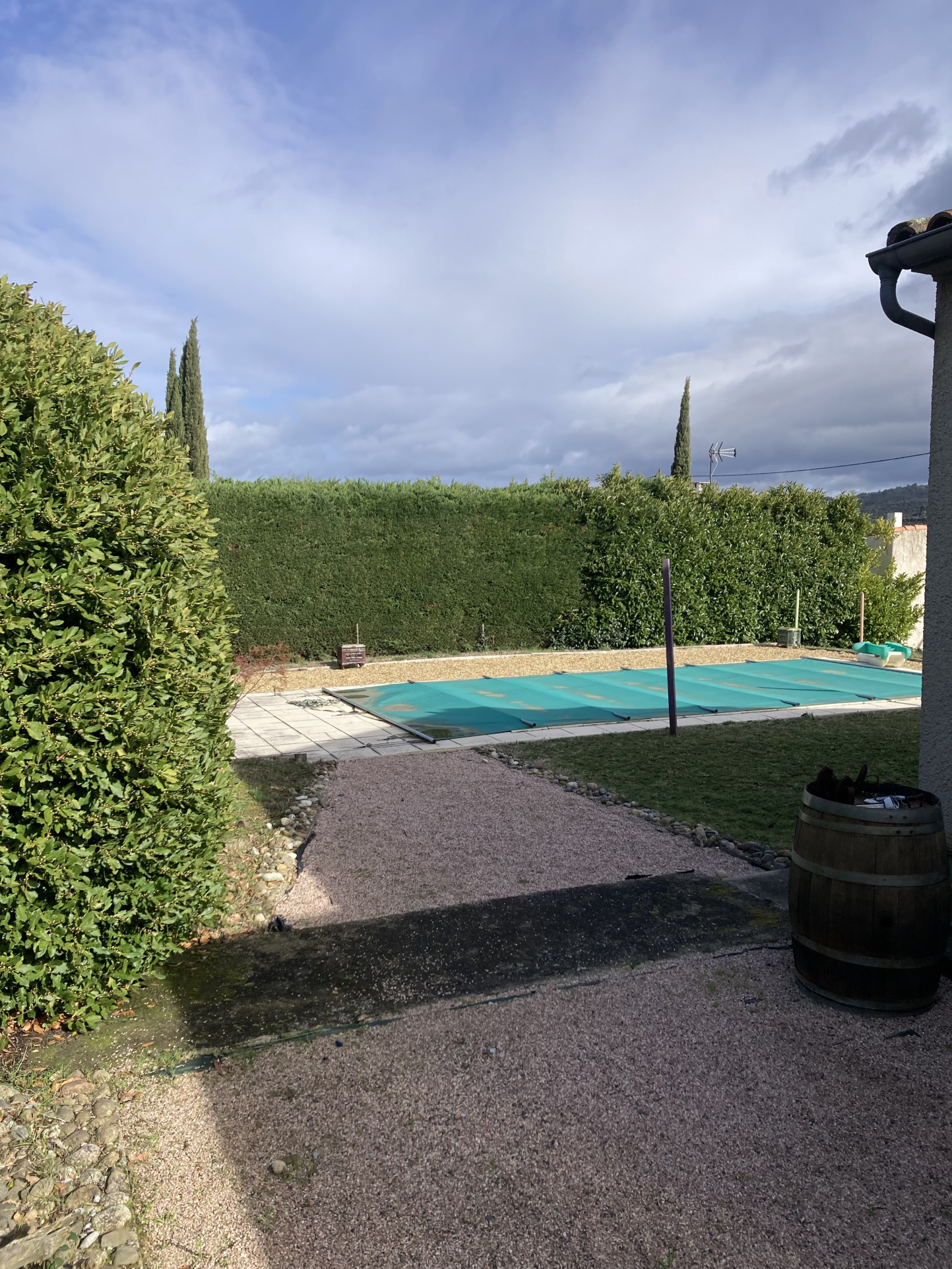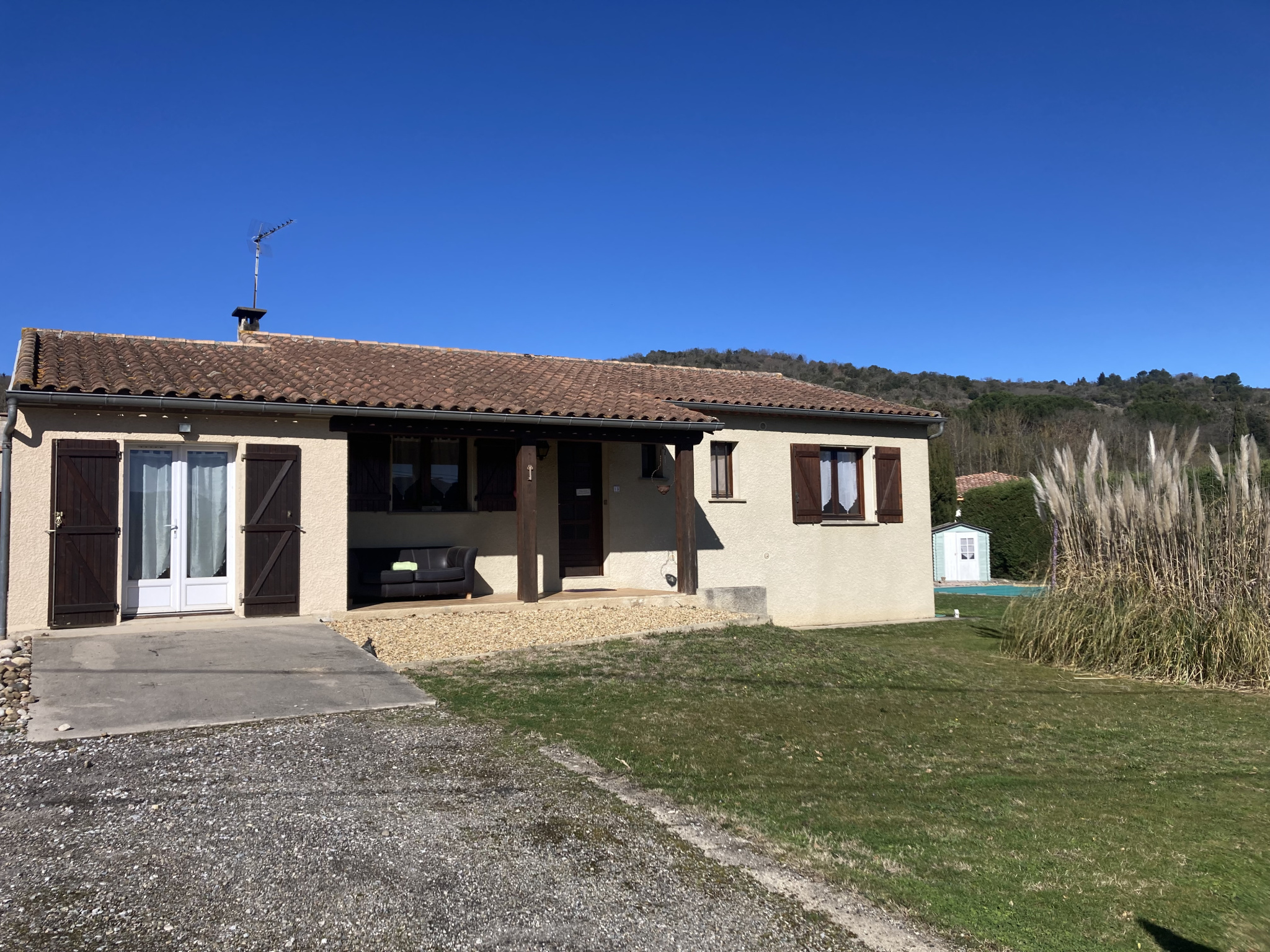 In a village with all amenities near Limoux, a detached villa on a beautiful plot with a swimming pool, 3 bedrooms, a living room with an insert fireplace, a conservatory, and terraces. In good condition and well-maintained, however, the single-glazed windows would benefit from replacement, and the property could be updated to modern standards.