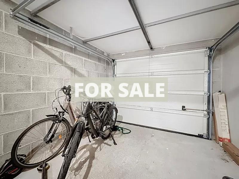 The house has a garage with an automatic door. Parking area.