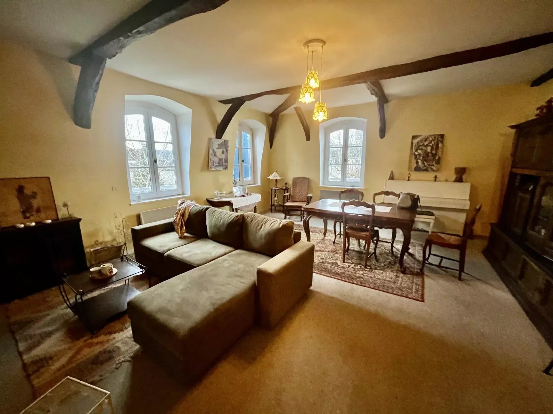 Town Centre Duplex Apartment in Salies-de-Béarn of approximately 90m² located on the 2nd and top floor of a building in the historical centre, comprising a large living/dining room, kitchen, two bedrooms, bathroom, and WC.